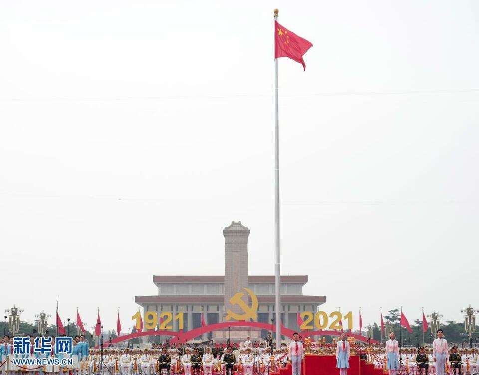 7月1日上午,庆祝中国共产党成立100周年大会在北京天安门广场隆重举行。这是升国旗仪式。